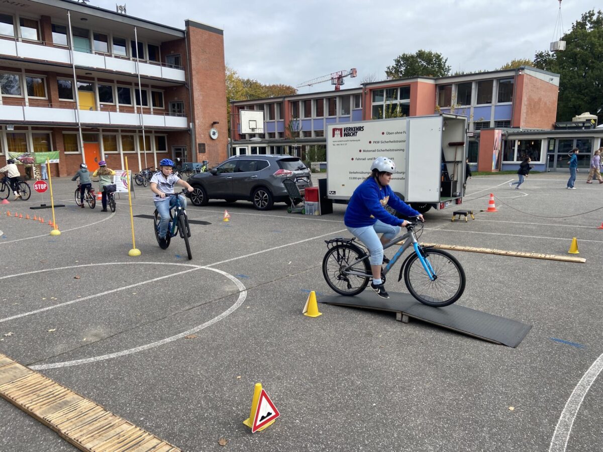 Heute war die Verkehrswacht Hamburg bei uns an der Schule und sorgte für jede Menge Bewegung und Fahrspaß! Für den 5. Jahrgang wurde auf dem Schulhof ein spannender Fahrradparcours aufgebaut, auf dem die Schülerinnen und Schüler ihr Können unter Beweis stellen konnten. Enge Kurven, kleine Hindernisse und knifflige Strecken forderten Geschick, Gleichgewicht und Konzentration.